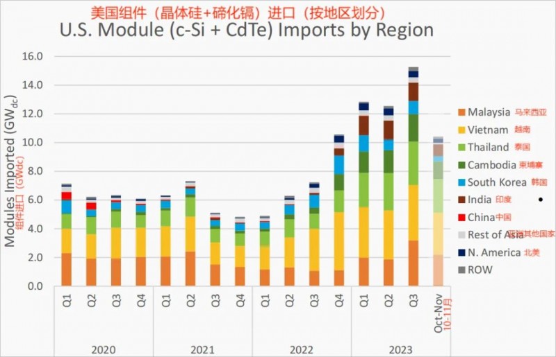 (2023年,中資光伏企業(yè)供應的光伏組件占當年運往美國市場總量的一半以上,其中超過98%的中資組件是在上述三國及一些東南亞國家生產(chǎn))