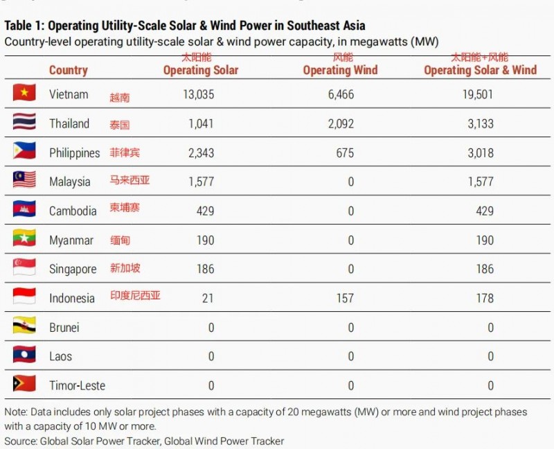 東南亞公用事業(yè)規(guī)模太陽能和風能發(fā)電容量:(單位:MW)