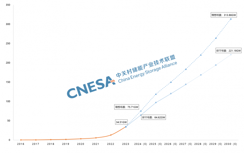 中關(guān)村儲能產(chǎn)業(yè)技術(shù)聯(lián)盟數(shù)據(jù)顯示,2023年中國新增投運(yùn)新型儲能裝機(jī)規(guī)模21.5GW/46.6GWh,功率和能量規(guī)模同比增長均超150%,且首次超過抽水蓄能新增投運(yùn)近四倍之多,共有超100個百兆瓦級項目實現(xiàn)投運(yùn),該規(guī)模量級項目數(shù)量同比增長370%。