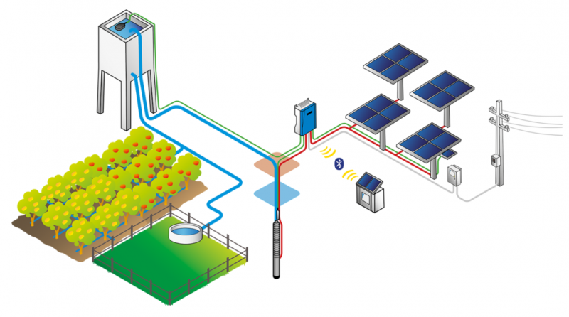 太陽(yáng)能光伏水泵系統(tǒng)主要由三個(gè)部分組成:太陽(yáng)能電池組件、光伏揚(yáng)水逆變器和三相交流、直流水泵。先進(jìn)的控制系統(tǒng),根據(jù)日照強(qiáng)度的變化調(diào)節(jié)水泵轉(zhuǎn)速,使輸出功率接近太陽(yáng)電池陣列的最大功率;當(dāng)日照很充足時(shí),保證水泵的轉(zhuǎn)速不超過(guò)額定轉(zhuǎn)速;當(dāng)日照不足時(shí),根據(jù)設(shè)定最低運(yùn)行頻率是否滿足,否則自動(dòng)停止運(yùn)行。水泵由電機(jī)驅(qū)動(dòng),從深井中抽水,注入蓄水箱/池,或直接接入灌溉系統(tǒng)。