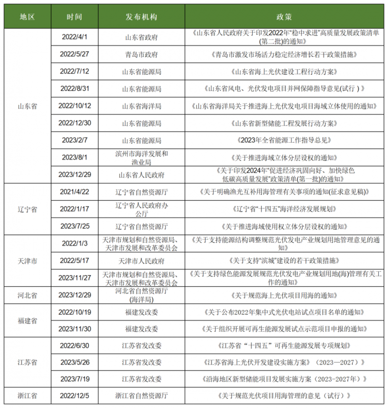 除了國家層面之外,近年來,山東、江蘇、遼寧、浙江等沿海省市都已出臺或醞釀出臺海上光伏的相關(guān)政策和規(guī)劃。