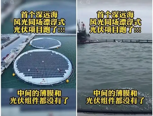 此外,技術(shù)問題也是一大挑戰(zhàn)。去年4月,一則“首個深遠(yuǎn)海風(fēng)光同場漂浮式光伏項目跑路”的視頻流傳網(wǎng)絡(luò),在業(yè)內(nèi)引發(fā)關(guān)注。在網(wǎng)傳視頻中,電站組件和薄膜均已消失不見。經(jīng)過確認(rèn),該項目為國家電投山東半島南3號海上風(fēng)電場20兆瓦深遠(yuǎn)海漂浮式光伏500千瓦實證項目,位于山東省海陽市南側(cè)海域。專家表示,基于該項目的技術(shù)方案,失散的光伏組件和薄膜大概率不是“飄走了”,而是“沉底了”,推測可能為波浪條件、機械設(shè)備問題引發(fā)項目事故。