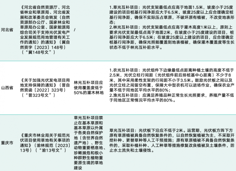 2023年3月20日,自然資源部辦公廳、國家林業(yè)和草原局辦公室、國家能源局綜合司印發(fā)了《關(guān)于支持光伏發(fā)電產(chǎn)業(yè)發(fā)展規(guī)范用地管理有關(guān)工作的通知》(自然資辦發(fā)〔2023〕12號,簡稱“12號文”),明確復(fù)合光伏項目光伏方陣用地不得改變地表形態(tài),并對光伏方陣用地的土地類型提出了新的要求,同時也要求復(fù)合光伏項目應(yīng)按照各地結(jié)合實地確定的建設(shè)和運營標準執(zhí)行。