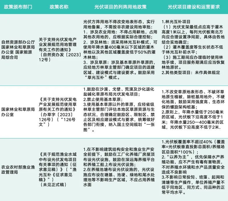 本文從國家與部分地方兩個層面展開,圍繞草光互補、林光互補、農(nóng)光互補、漁光互補等常見復(fù)合光伏項目類型,總結(jié)梳理復(fù)合型光伏項目的列陣用地政策以及建設(shè)運營要求,同時提出相關(guān)合規(guī)風(fēng)控建議,供大家參考。