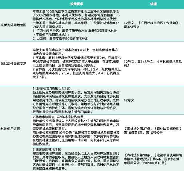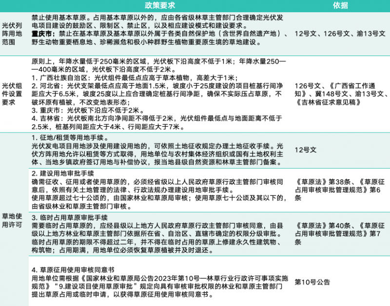 基于以上第二部分所述的規(guī)定,同時根據(jù)《草原法》《森林法》《國家林業(yè)和草原局公告2023年第10號—林草行業(yè)行政許可事項實施規(guī)范》(“第10號公告”)等相關(guān)法律法規(guī)及政策規(guī)定,筆者將常見的復(fù)合光伏項目類型,即草光互補、林光互補、農(nóng)光互補、漁光互補等的光伏列陣用地范圍以及項目建設(shè)和運營要求總結(jié)如下: