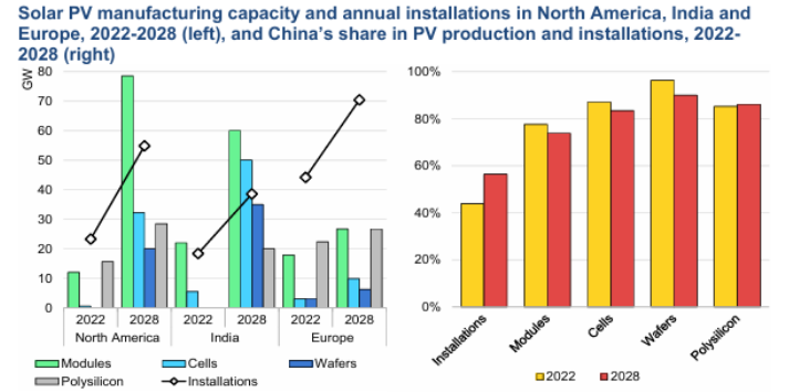 預(yù)計(jì)到2028年,光伏產(chǎn)品大部分增長(zhǎng)的產(chǎn)能來(lái)自中國(guó),預(yù)計(jì)占到光伏組件的85%,多晶硅占到95%。受俄烏沖突等地緣政治事件引發(fā)的對(duì)能源安全的擔(dān)憂以及許多國(guó)家清潔能源愿望日益增長(zhǎng)的推動(dòng),中國(guó)光伏制造商為此大幅增加了投資,以應(yīng)對(duì)全球光伏需求的動(dòng)態(tài)增長(zhǎng)。