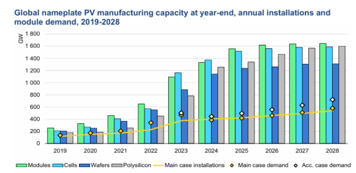 圖1 2019~2028年底全球光伏組件產(chǎn)能、年度裝機(jī)容量和光伏組件需求