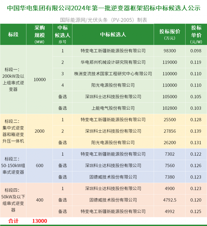 4月29日,中國華電集團(tuán)有限公司2024年第一批逆變器框架招標(biāo)中標(biāo)候選人公示。