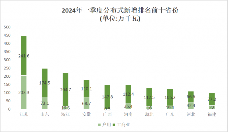 2024年一季度,戶用光伏新增并網(wǎng)容量排名前十的省份包括江蘇(2.03GW)、山東(0.73GW)、安徽(0.687GW)、遼寧(0.48GW)、河北(0.424GW)、陜西(0.404GW)、河南(0.354GW)、山西(0.277GW)、福建(0.22GW)、廣東(0.191GW)