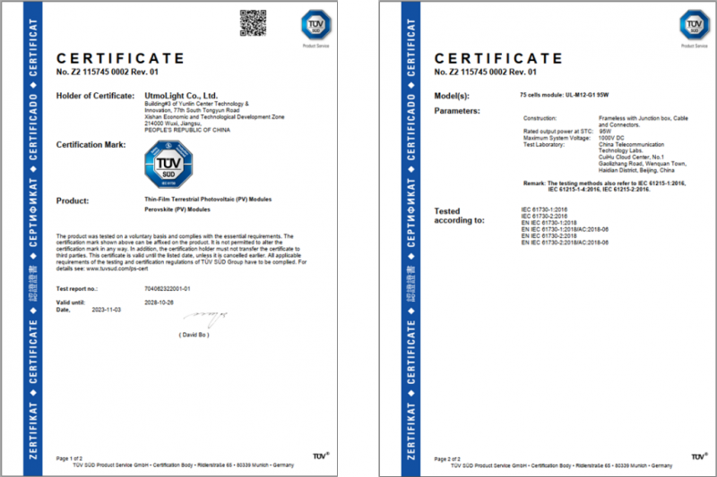 極電光能1.2m×0.6m鈣鈦礦組件IEC認(rèn)證證書(shū)