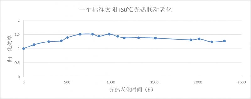 因此,除通過(guò)IEC各項(xiàng)測(cè)試外,借鑒國(guó)際標(biāo)準(zhǔn)化組織(ISO)制定的InternationalSummitonOrganicPhotovoltaicStability(ISOS)協(xié)議,參照ISOS-L條款進(jìn)行了“光熱聯(lián)合老化測(cè)試”,即在一個(gè)標(biāo)準(zhǔn)太陽(yáng)下(AM1.5光譜,輻照強(qiáng)度1KW/m2),同時(shí)附加60℃溫度,對(duì)鈣鈦礦組件進(jìn)行聯(lián)合加速老化。