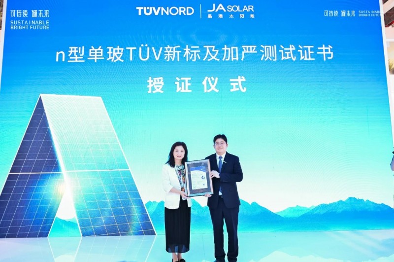 在此基礎(chǔ)上,TÜVNORD全球可再生能源高級(jí)副總裁、全球智慧能源中心總裁、大中華區(qū)副總裁須婷婷為晶澳科技單玻防積灰產(chǎn)品頒發(fā)了“n型單玻TÜV新標(biāo)及加嚴(yán)測(cè)試證書”,再次印證了晶澳科技一以貫之的穩(wěn)健可靠品質(zhì)。