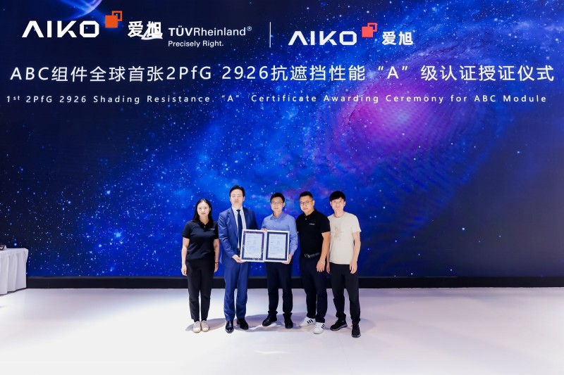 愛旭對極限轉(zhuǎn)換效率及至高品質(zhì)的不懈追求,獲得了國際權(quán)威機構(gòu)的專業(yè)認證。本次展會上,TüV萊茵為愛旭頒發(fā)了ABC滿屏組件TüV Mark認證證書及ABC組件全球首張2PfG 2926抗遮擋性能“A”級認證證書,ABC組件的卓越品質(zhì)將為愛旭在全球新能源賽道上的加速領(lǐng)跑注入強勁動力。