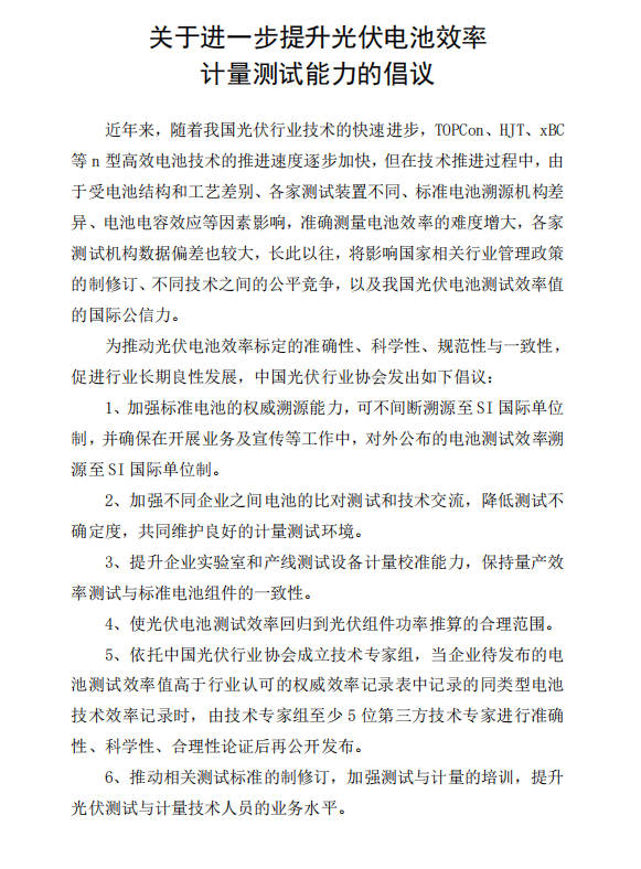 關(guān)于進(jìn)一步提升光伏電池效率計(jì)量測(cè)試能力的倡議