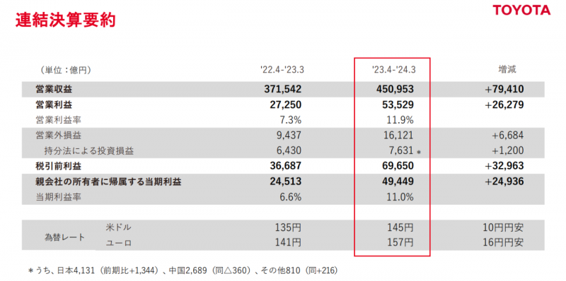 正是不久前公布2023財報業(yè)績報告的豐田。數(shù)據(jù)顯示,2023財年,豐田累計營業(yè)收入高達(dá)45.095萬億日元(折合人民幣2.09萬億元),同比增長21%。;營業(yè)利潤5.353萬億日元(折合人民幣2490億元),首次突破5萬億日元,同比增長96%;凈利潤實(shí)現(xiàn)4.9萬億日元(折合人民幣2281億元),同比增長101%。這個盈利數(shù)字不僅刷新了豐田自己的記錄,也讓豐田再度成為“全球最賺錢的汽車企業(yè)”。