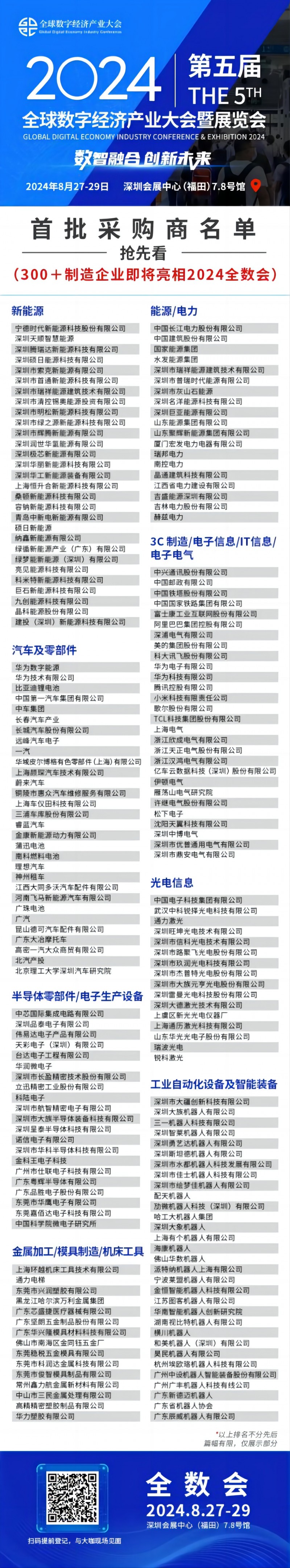 此次公布的300家采購(gòu)商企業(yè),眾多企業(yè)表示是攜明確的采購(gòu)需求觀展,其中不乏世界500強(qiáng)、數(shù)字經(jīng)濟(jì)領(lǐng)域知名企業(yè),如華為技術(shù)、一汽、長(zhǎng)城汽車、寧德時(shí)代、長(zhǎng)江電力、電子科技、通力電梯、大疆科技、大族機(jī)器人、通力激光、中國(guó)建筑、科大訊飛、TCL科技、美的集團(tuán)、華星光電、中車集團(tuán)、歌爾股份、松下電子等。