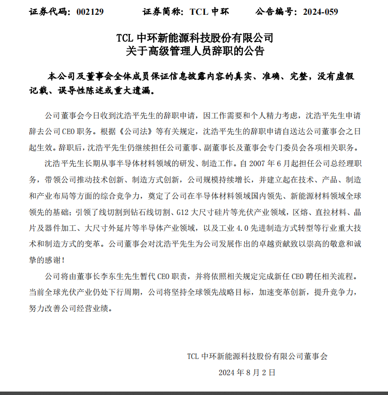 公告中未提及沈浩平辭職的具體原因。從TCL中環(huán)所處的光伏產(chǎn)業(yè)發(fā)展環(huán)境來看,3年上升周期已成過去,自2023年第三季度始,行業(yè)進(jìn)入下行周期。
