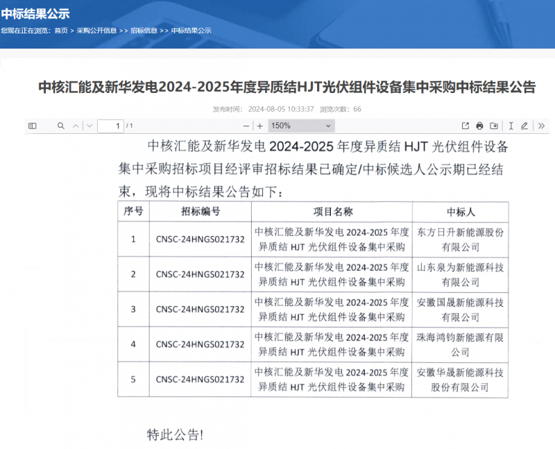 此項目中標五家單位之一國晟科技,其N型HJT產(chǎn)品近期屢獲央國企客戶認可,市場占比和品牌影響力提升顯著。僅觀察其過去幾個月面向國內(nèi)大型集中式光伏項目的合同簽約情況,先后有中廣核煙臺招遠400MW海上光伏項目、中廣核萊州土山600MW鹽光互補項目,中綠電若羌4GW光伏II標段項目,又在此次中核匯能及新華發(fā)電2GW集采招標中再度入圍上榜。