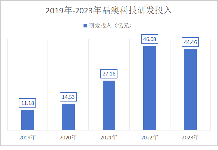 2019-2022年,晶澳科技的研發(fā)投入分別為11.18億元、14.53億元、27.18億元、46.08億元,2021、2022年兩年的研發(fā)投入合計超73億元。2023年,晶澳科技研發(fā)投入44.46億元,占營業(yè)收入5.45%,位居同行業(yè)前列。截至2023年末,公司自主研發(fā)已授權(quán)專利1263項,其中發(fā)明專利285項。