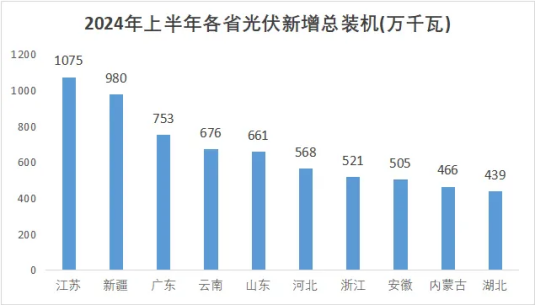 根據最新數(shù)據顯示,2024年上半年,江蘇新增光伏裝機排名已躍居全國之首,新增裝機數(shù)量高達10.75GW,同比增長近92%,其中地面電站新增1.275GW,工商業(yè)光伏新增4.43GW,戶用光伏新增5.052GW;截至2024年6月底,江蘇累計光伏裝機已達50.033GW,排名全國第三。