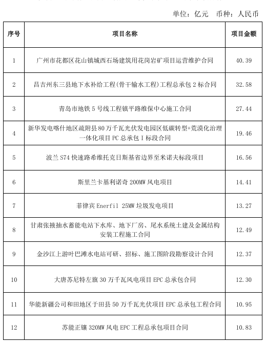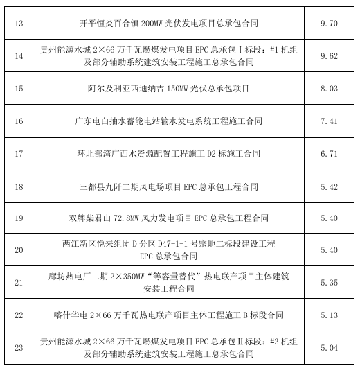 注:1.能源電力業(yè)務包括水電、風電、太陽能發(fā)電、火電、電網(wǎng)等;2.水資源與環(huán)境業(yè)務包括水利、水務、水環(huán)境治理和水生態(tài)修復等;3.城市建設與基礎設施業(yè)務包括市政、房建、鐵路、城市軌道交通、公路、機場、港口與航道等;4.其他業(yè)務指除以上三項業(yè)務外的業(yè)務;5.上表中分項數(shù)據(jù)加總之和與合計數(shù)之間的差異系四舍五入原因所致。