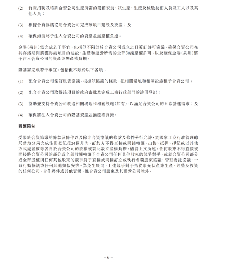 公告提出,金陽(泉州)將于合資協(xié)議有效期內(nèi)自費維持該項目的HBC產(chǎn)品相關知識產(chǎn)權的有效性。自合資公司成立日期起計60個工作日內(nèi),金陽(泉州)應與合資公司訂立知識產(chǎn)權許可協(xié)議,許可合資公司支付許可費,以使用生產(chǎn)及制造HBC產(chǎn)品所需的全部知識產(chǎn)權。