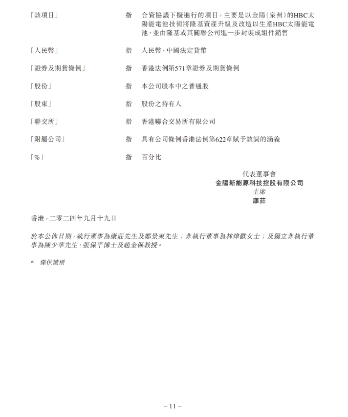 合資公司的名稱為金隆(西安)新能源科技有限公司,經(jīng)營范圍為生產(chǎn)及銷售太陽能電池,均以中國西安市市場監(jiān)督管理局或國家市場監(jiān)督管理總局最終核準登記為準。