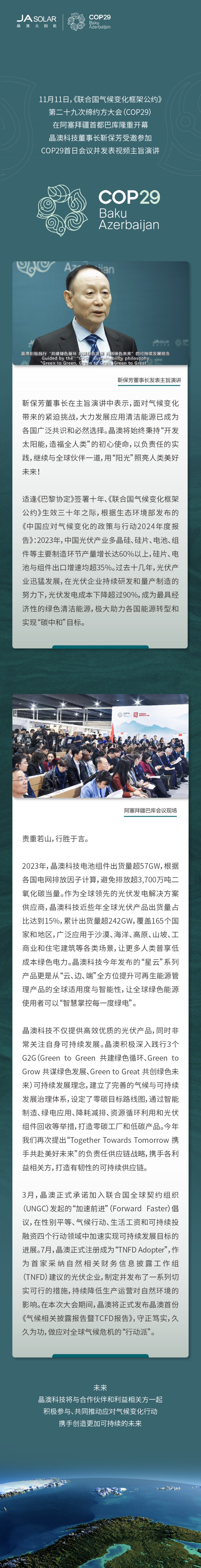 11月11日,《聯(lián)合國(guó)氣候變化框架公約》第二十九次締約方大會(huì)(COP29)在阿塞拜疆首都巴庫(kù)隆重開(kāi)幕,晶澳科技董事長(zhǎng)靳保芳受邀參加COP29首日會(huì)議并發(fā)表視頻主旨演講。