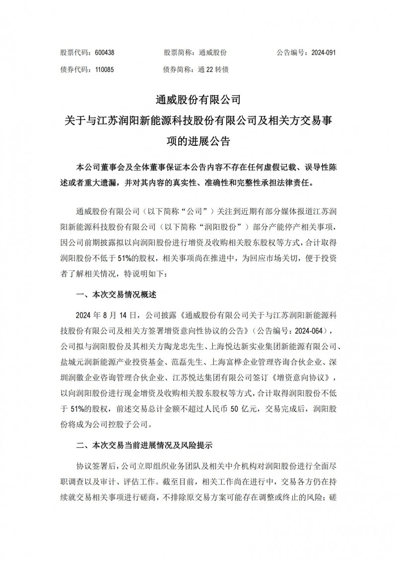 今年8月,通威股份宣布公司擬與潤陽股份、上海悅達(dá)新實(shí)業(yè)集團(tuán)新能源有限公司等潤陽股份相關(guān)股東、江蘇悅達(dá)集團(tuán)有限公司簽訂《增資意向協(xié)議》。協(xié)議簽訂后,由江蘇悅達(dá)集團(tuán)對(duì)潤陽股份進(jìn)行現(xiàn)金增資10億元。在公司完成對(duì)潤陽股份盡職調(diào)查以及審計(jì)、評(píng)估工作,并與各方達(dá)成正式增資具體方案后,將以自有或自籌資金向潤陽股份現(xiàn)金增資,同時(shí)現(xiàn)金收購江蘇悅達(dá)集團(tuán)前述增資10億元所取得的潤陽股份股權(quán)。