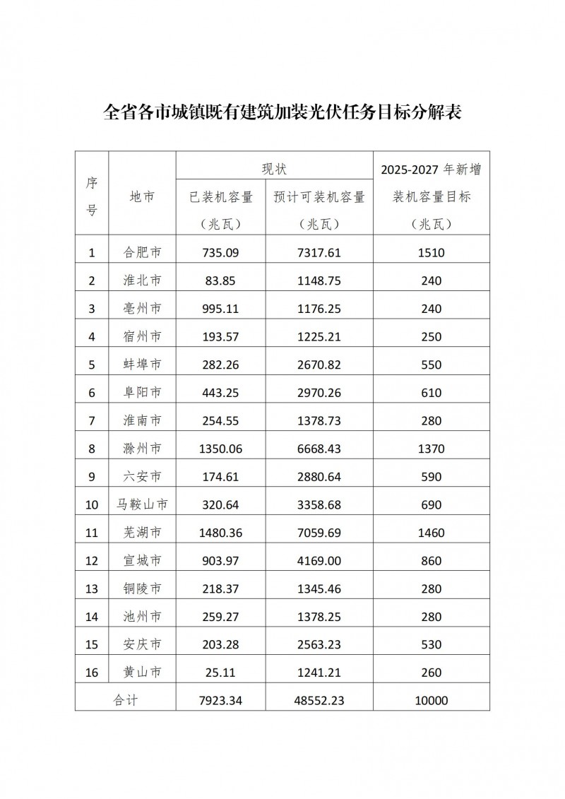 到2027年,新增城鎮(zhèn)既有建筑加裝光伏裝機容量力爭達到10000兆瓦,建筑光伏一體化在全省各類建筑實現(xiàn)規(guī)?;?、市場化應用,基本形成安徽特色建筑光伏產(chǎn)業(yè)高質量發(fā)展格局。