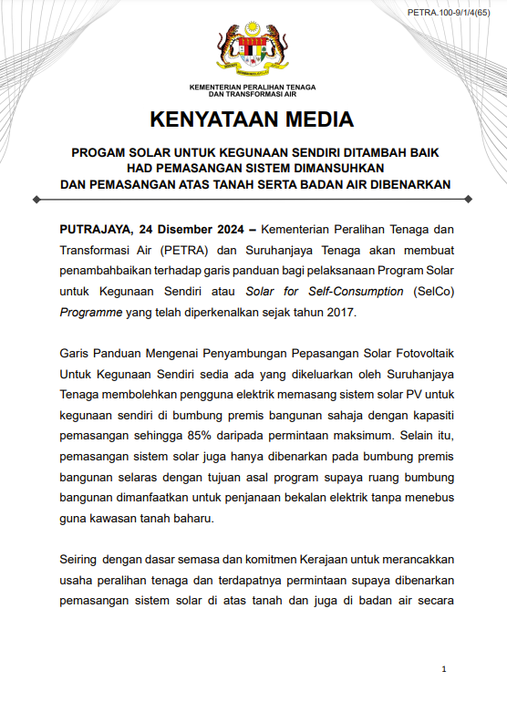為加速能源轉(zhuǎn)型,馬來(lái)西亞政府于12月24日進(jìn)一步公布了取消非住宅用戶容量限制并將安裝地點(diǎn)擴(kuò)大到屋頂以外的計(jì)劃。