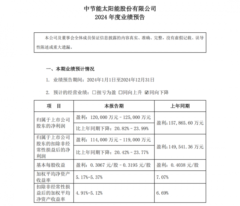 對于2024年全年業(yè)績較上年同期下降,公司認(rèn)為主要是由于:一是發(fā)電板塊部分區(qū)域本期電網(wǎng)消納不足,同時電力交易市場化規(guī)模擴(kuò)大、平均電價下降;二是制造板塊受光伏市場行情影響,本期銷量和銷售價格較上年同期下降。