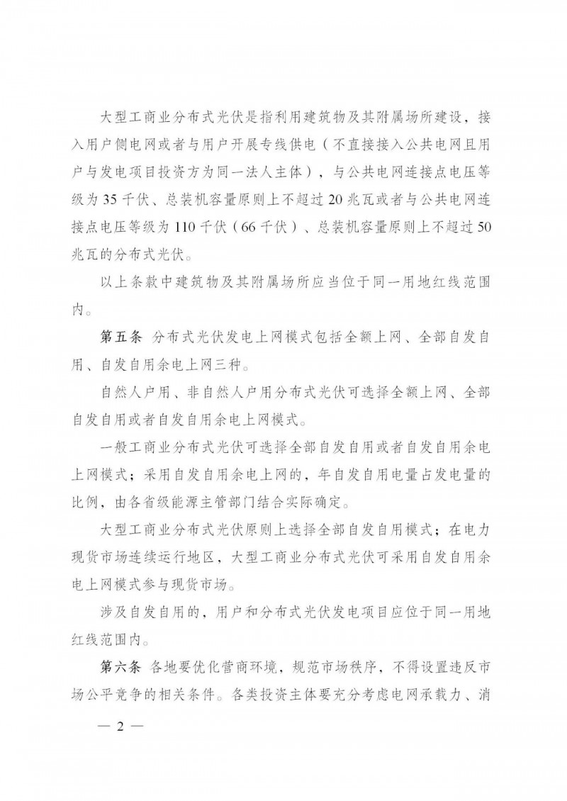 大型工商業(yè)分布式光伏原則上選擇全部自發(fā)自用模式;在電力現(xiàn)貨市場連續(xù)運行地區(qū),大型工商業(yè)分布式光伏可采用自發(fā)自用余電上網(wǎng)模式參與現(xiàn)貨市場。涉及自發(fā)自用的,用戶和分布式光伏發(fā)電項目應位于同一用地紅線范圍內(nèi)。