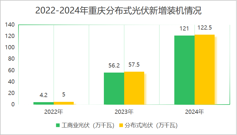 具體來看,重慶分布式光伏裝機(jī)容量增長迅猛,2024年新增裝機(jī)達(dá)到122.5萬千瓦,同比增長113%,延續(xù)了2023年增速全國第一的亮眼表現(xiàn);其中工商業(yè)分布式新增裝機(jī)121萬千瓦,占比近99%,發(fā)展勢(shì)頭強(qiáng)勁。