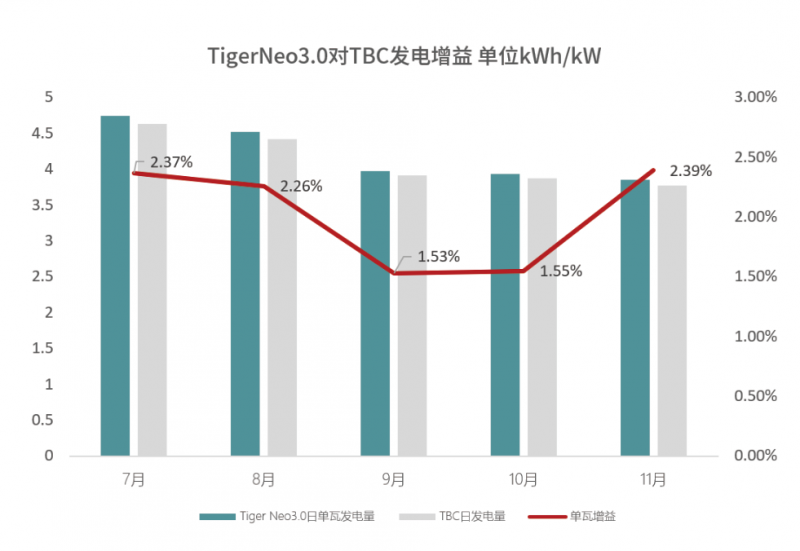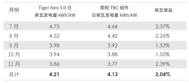 數(shù)據(jù)顯示,在2024年7月-11月測試期間,TigerNeo3.0組件日平均發(fā)電4.21kWh/kW,TBC組件日平均發(fā)電4.13kWh/kW,發(fā)電量增益為2.04%。這一結(jié)果充分證明了晶科TOPCon技術(shù)TigerNeo3.0組件在高效發(fā)電方面的顯著優(yōu)勢。