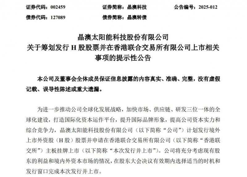2月21日,晶澳科技(SZ:002459)發(fā)布公告,為進(jìn)一步推動(dòng)公司全球化發(fā)展戰(zhàn)略,加快市場(chǎng)、供應(yīng)鏈、研發(fā)三位一體的全球化建設(shè),打造國(guó)際化資本運(yùn)作平臺(tái),提升國(guó)際品牌形象,提高公司資本實(shí)力和綜合競(jìng)爭(zhēng)力,公司計(jì)劃發(fā)行境外上市外資股(H股)股票并申請(qǐng)?jiān)谙愀勐?lián)合交易所有限公司主板掛牌上市。