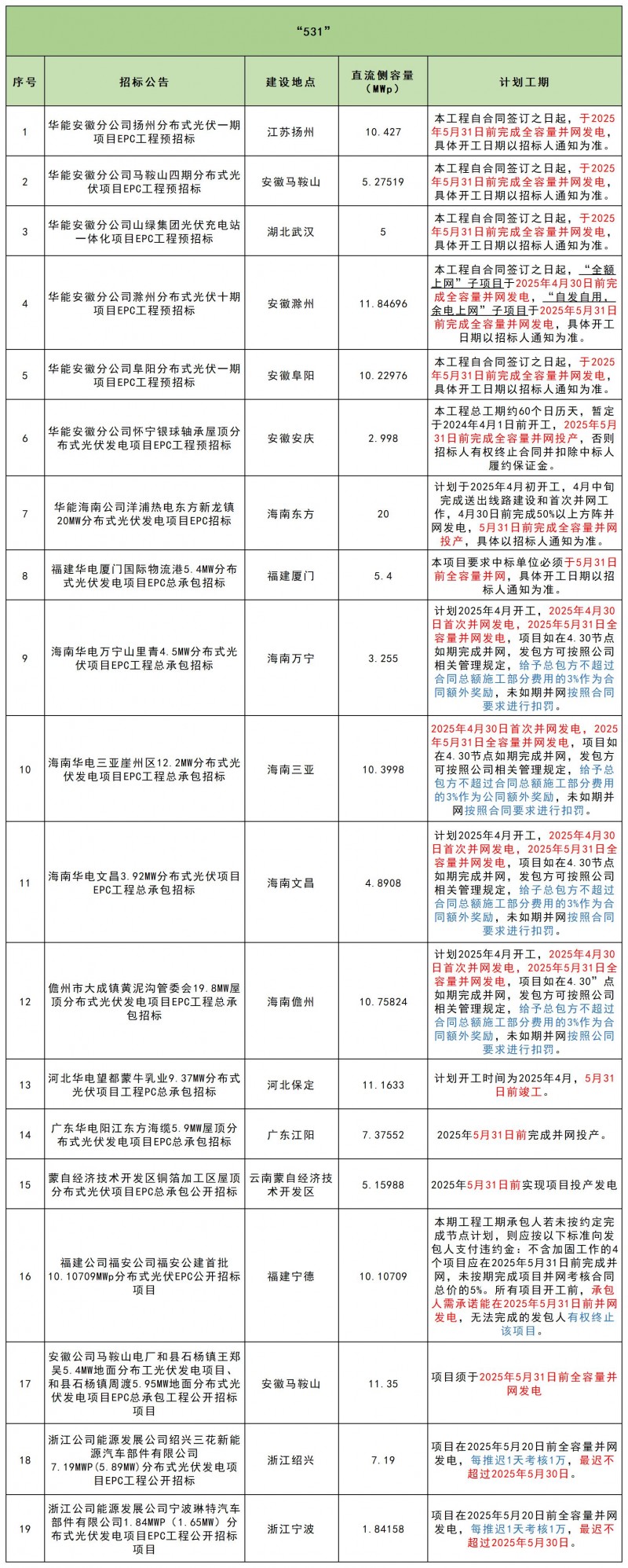 3月15日華能發(fā)布的【華能安徽分公司揚(yáng)州分布式光伏一期項(xiàng)目EPC工程預(yù)招標(biāo)】、【華能安徽分公司馬鞍山四期分布式光伏項(xiàng)目EPC工程預(yù)招標(biāo)】、【華能安徽分公司馬鞍山四期分布式光伏項(xiàng)目EPC工程預(yù)招標(biāo)】等招標(biāo)公告中,皆明確于2025年5月31日前完成全容量并網(wǎng)發(fā)電。