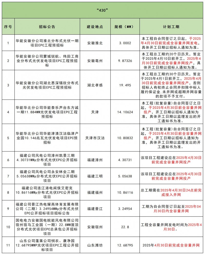 3月15日華能發(fā)布的【華能安徽分公司淮北分布式光伏一期項(xiàng)目EPC工程預(yù)招標(biāo)】、【華能安徽分公司蒙城銳航、偉田工商業(yè)分布式光伏發(fā)電項(xiàng)目EPC工程預(yù)招標(biāo)】等招標(biāo)公告中,則明確于2025年4月30日前完成全容量并網(wǎng)發(fā)電。