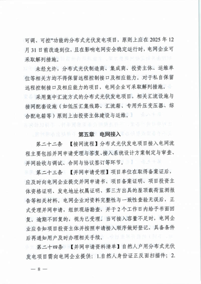 已經(jīng)開工建設(shè)的,除能夠在2025年5月1日前并網(wǎng)投產(chǎn)的項(xiàng)目之外,應(yīng)暫停項(xiàng)目施工,按照本細(xì)則調(diào)整上網(wǎng)方式和建設(shè)方案。在2025年5月1日之后并網(wǎng)投產(chǎn)的項(xiàng)目,上網(wǎng)電量的比例、結(jié)算一律按照本細(xì)則執(zhí)行。