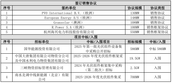 近期,公司組件業(yè)務(wù)實(shí)現(xiàn)大型銷售協(xié)議簽署及主要項(xiàng)目中標(biāo)/入圍情況披露如下: