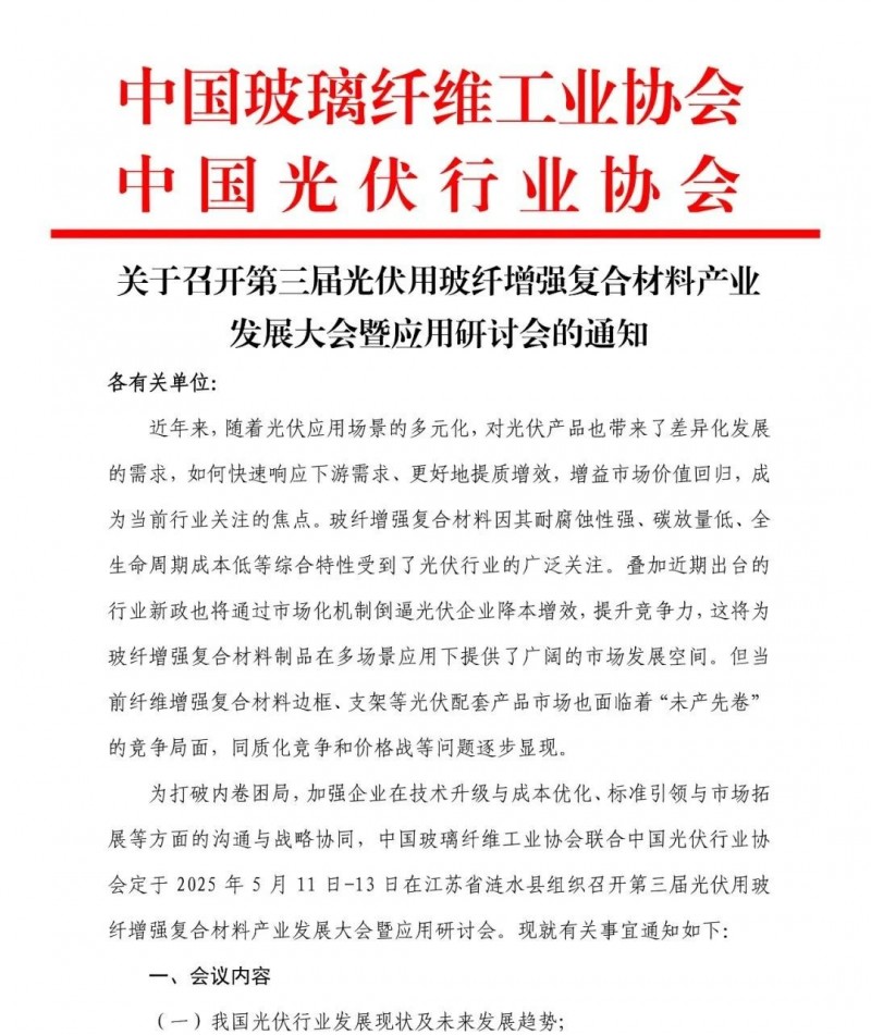 中國玻璃纖維工業(yè)協(xié)會(huì)聯(lián)合中國光伏行業(yè)協(xié)會(huì)定于