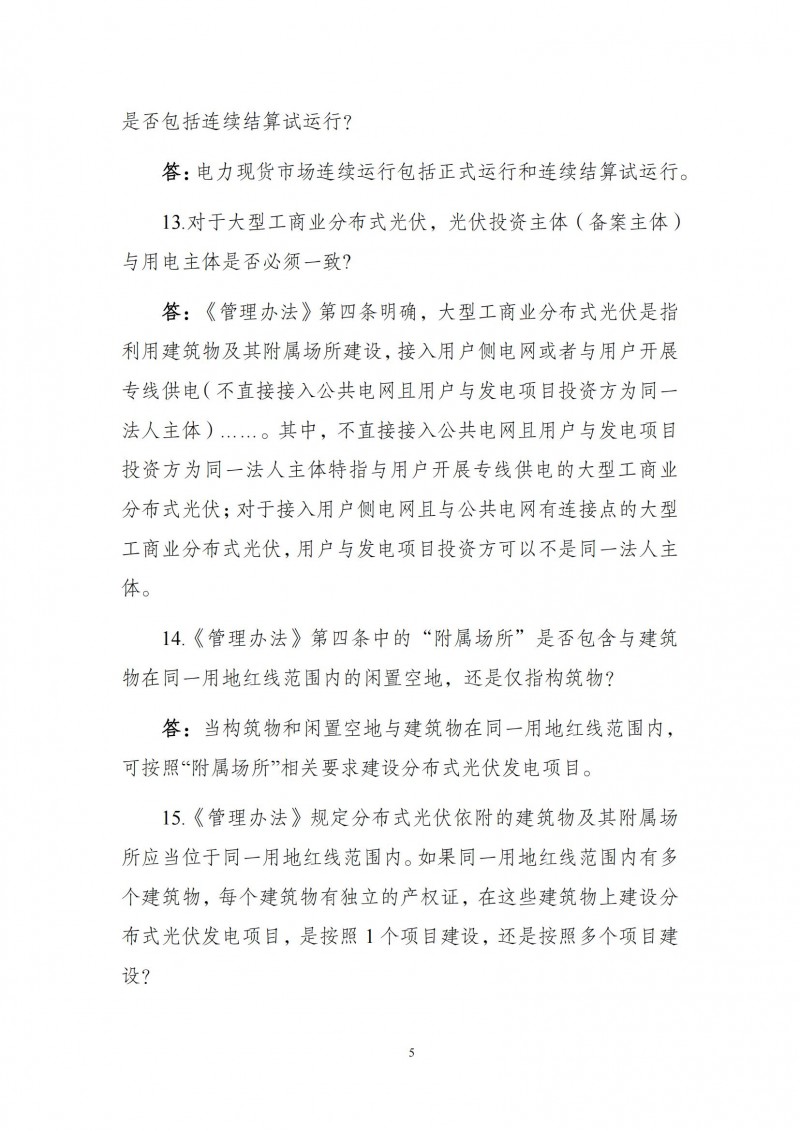 答:不直接接入公共電網(wǎng)且用戶與發(fā)電項(xiàng)目投資方為同一法人主體,特指與用戶開展專線供電的大型工商業(yè)分布式光伏;對(duì)于接入用戶側(cè)電網(wǎng)且與公共電網(wǎng)有連接點(diǎn)的大型工商業(yè)分布式光伏,用戶與發(fā)電項(xiàng)目投資方可以不是同一法人主體。