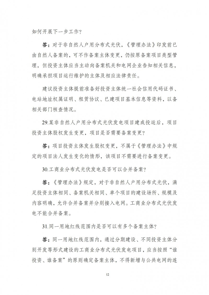 答:同一用地紅線范圍內(nèi),通過分期建設(shè)、不同投資主體分別開發(fā)等形式建設(shè)的工商業(yè)分布式光伏發(fā)電項(xiàng)目,應(yīng)當(dāng)按照“誰投資、誰備案”的原則確定備案主體,不得新增與公共電網(wǎng)的連接點(diǎn)。