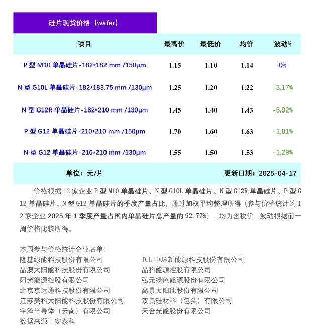 本周硅片價(jià)格大幅下跌,其中N型G10L單晶硅片(182*183.75mm/130μm/256mm)成交均價(jià)在1.22元/片,周環(huán)比跌幅3.17%;N型G12R單晶硅片(182*210mm/130μm)成交均價(jià)在1.43元/片,周環(huán)比跌幅5.92%;P型G12單晶硅片(210*210mm/150um)成交均價(jià)在1.63元/片,周環(huán)比跌幅1.81%;N型G12單晶硅片(210*210mm/150μm)成交均價(jià)在1.53元/片,周環(huán)比跌幅1.29%。本周上下游看跌后市情緒較為濃厚,部分企業(yè)恐慌性低價(jià)出貨,硅片價(jià)格繼續(xù)下行。