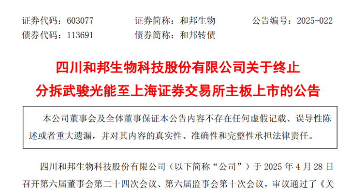 公告中提到,自籌劃此次分拆上市事宜起,和邦生物便積極推進各項工作,包括組織中介機構(gòu)開展盡職調(diào)查等,并嚴格依照相關(guān)法律法規(guī)及規(guī)范性文件要求,履行了必要的決策程序與信息披露義務(wù)。然而,鑒于當(dāng)前市場環(huán)境相較于籌劃分拆上市時已出現(xiàn)重大變化,經(jīng)公司與相關(guān)方充分溝通并審慎評估后,為切實保障公司及廣大投資者的利益,和邦生物決定終止武駿光能至上交所主板的分拆上市工作,并撤回相關(guān)上市輔導(dǎo)材料。