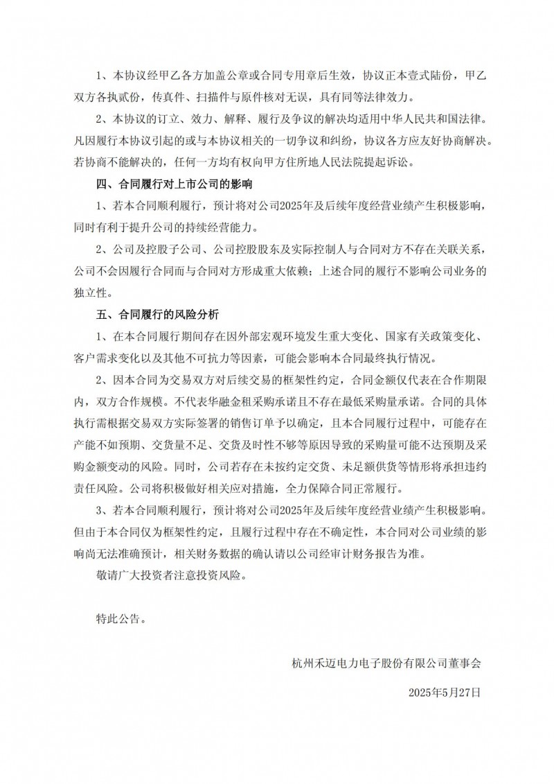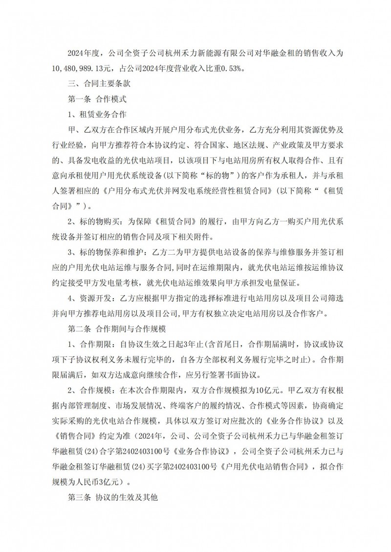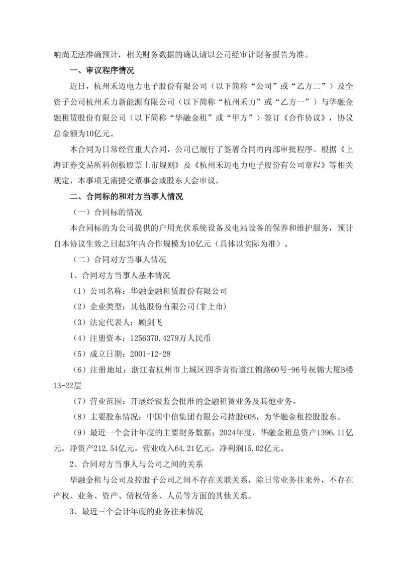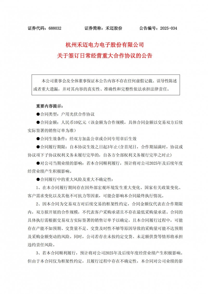 日前,禾邁股份發(fā)布公告,禾邁股份及全資子公司與華融金融租賃股份有限公司簽訂合作協(xié)議,本合同標(biāo)的為公司提供的戶用光伏系統(tǒng)設(shè)備及電站設(shè)備的保養(yǎng)和維護(hù)服務(wù),預(yù)計(jì)自本協(xié)議生效之日起3年內(nèi)合作規(guī)模為10億元(具體以實(shí)際為準(zhǔn))。具體金額以實(shí)際簽署的銷(xiāo)售訂單為準(zhǔn)。該合同為公司日常經(jīng)營(yíng)重大合同,預(yù)計(jì)將對(duì)公司2025年及后續(xù)年度經(jīng)營(yíng)業(yè)績(jī)產(chǎn)生積極影響。