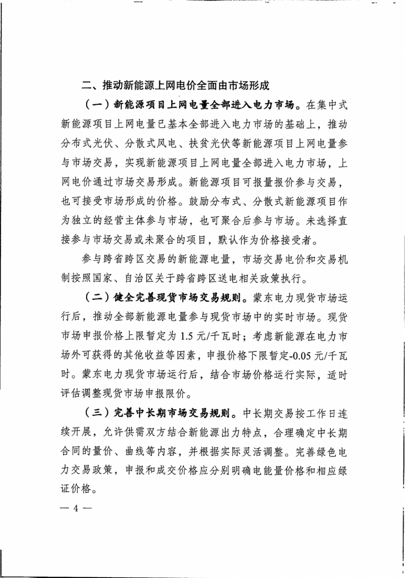 健全完善現(xiàn)貨市場交易規(guī)則。蒙東電力現(xiàn)貨市場運行后,推動全部新能源電量參與現(xiàn)貨市場中的實時市場?,F(xiàn)貨市場申報價格上限暫定為1.5元/千瓦時;考慮新能源在電力市場外可獲得的其他收益等因素,申報價格下限暫定-0.05元/千瓦時。蒙東電力現(xiàn)貨市場運行后,結(jié)合市場價格運行實際,適時評估調(diào)整現(xiàn)貨市場申報限價。