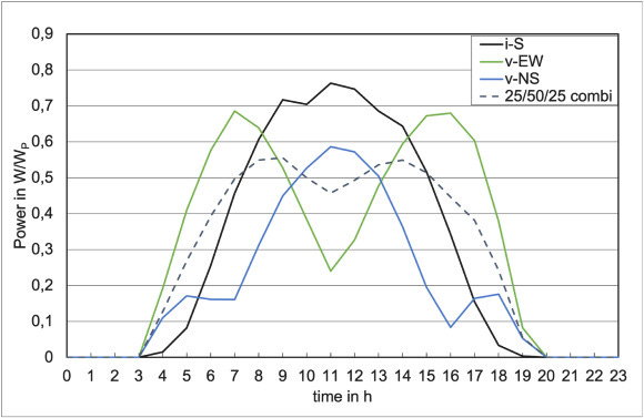 以下圖(德國)為例,綠線代表垂直東西向安裝光伏,藍線代表垂直南北向安裝,黑線則代表傾斜南向安裝,三者之中垂直東西向的曲線尤為突出,其發(fā)電峰值出現(xiàn)在一天的開始和結(jié)束時。