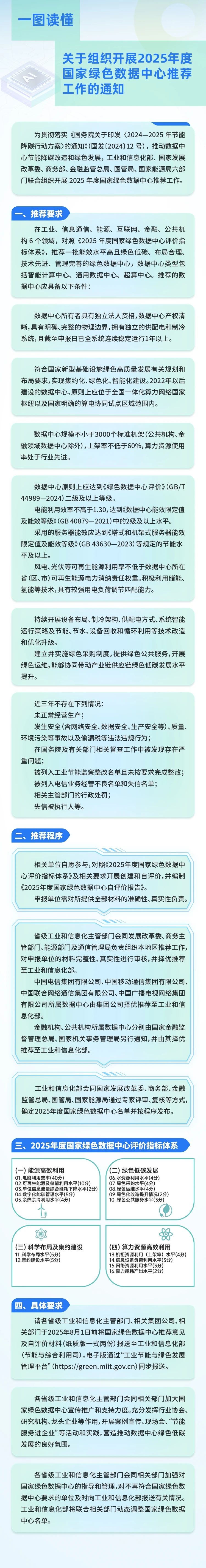 為貫徹落實(shí)《國務(wù)院關(guān)于印發(fā)〈2024—2025年節(jié)能降碳行動(dòng)方案〉的通知》(國發(fā)〔2024〕12號),推動(dòng)數(shù)據(jù)中心節(jié)能降碳改造和綠色發(fā)展,現(xiàn)組織開展2025年度國家綠色數(shù)據(jù)中心推薦工作。有關(guān)事項(xiàng)通知如下: