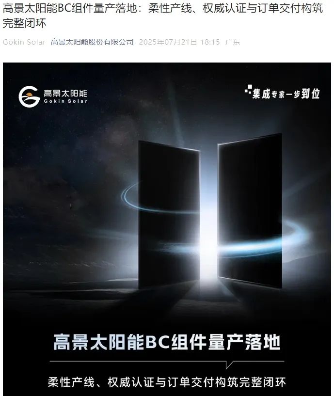 7月21日晚間,高景太陽能宣布其BC組件量產(chǎn)落地,高景太陽能現(xiàn)已完全具備BC技術(shù)大規(guī)模、高質(zhì)量、可持續(xù)的量產(chǎn)能力,并正在將其轉(zhuǎn)化為顯著的市場競爭優(yōu)勢。